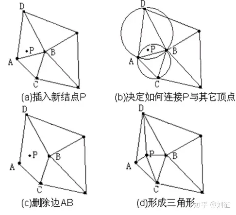 (2)将点集中的散点依次插入,在三角形链表中找出其外接圆包含插入点的三角形(称为该点的影响三角形),删除影响三角形的公共边,将插入点同影响三角形的全部顶点连接起来,从而完成一个点在 Delaunay 三角形链表中的插入;