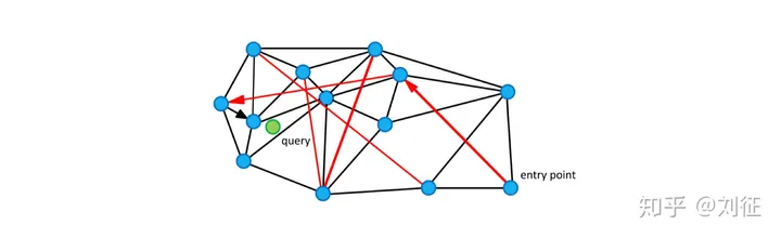 NSW论文中配了这样一张图,黑色是近邻点的连线,红色线就是“高速公路机制”了。我们从enter point点进入查找,查找绿色点临近节点的时候,就可以用过红色连线“高速公路机制”快速查找到结果。高速公路是怎么形成的呢?在初始建图时,点还很少,这时连接的m个点在建图后期中间可能加入了成千上万个点,所以在建图初期连接的这些边就自然变成了“高速公路”。