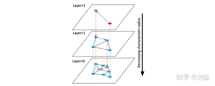 2.自顶层向q的层数l逼近搜索,一直到l+1,每层寻找当前层q最近邻的1个点