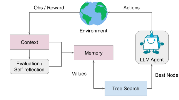 在中心是LLM Agent,也就是语言模型,它起到整个系统的核心作用。左边是一个 Tree Search 模块,这实现了蒙特卡罗树搜索,用来有效地构建推理路径,实现决策规划。右边是Environment,也就是外部环境。Agent可以在这个环境中进行交互,产生 Actions 和收到 Observations。Agent 和 Environment 通过文本的形式进行交互,这样可以利用语言模型本身优秀的自然语言理解能力。在 Agent 内部引入了Context Memory,可以存储之前的语境,用于之后的决策更新。还有一个 Self-reflection 模块,当遇到失败情况时,可以提供文本反馈,指出错误原因并给出改进建议。整个系统的目标是利用语言模型本身的知识表达、推理和补全的能力,在与外部环境交互的过程中,通过误差学习、决策树搜索等方式进行自我完善,实现可靠的决策。最终找到 the Best Node,也就是推理/决策路径中最佳的节点,产生 model 输出。