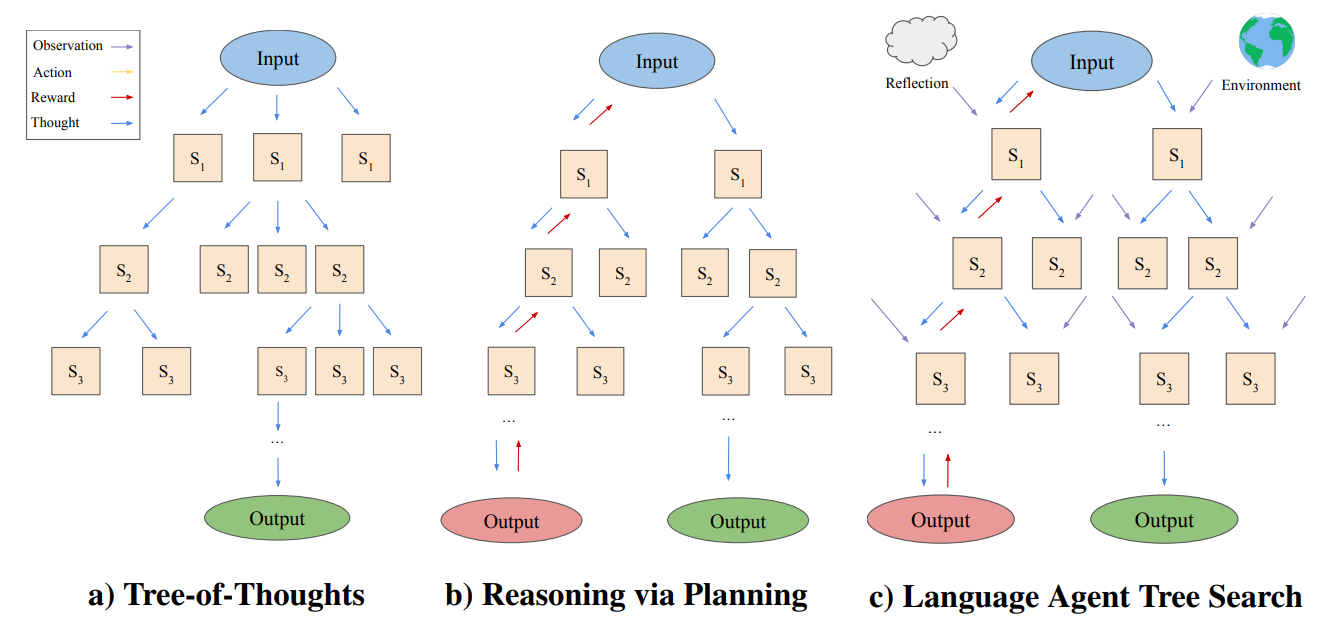 ToT和RAP仅依赖于语言模型的内部知识进行状态扩展和评估。而LATS引入了环境(Environment)的反馈。