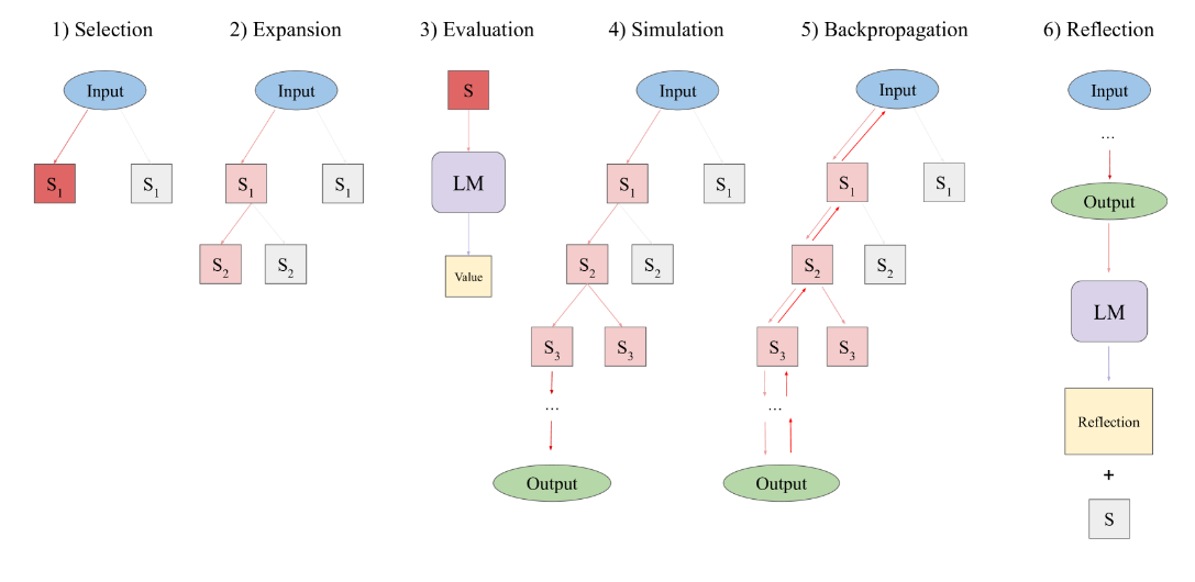 - Simulation(模拟):从当前选择的节点开始扩展,采样高评分的节点直到达到终止节点,为整个解决方案轨迹提供反馈。