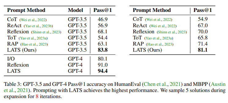 本文研究了在编程任务中使用外部观察的重要性,通过在Humaneval和MBPP数据集上评估基线和LATS的表现,发现搜索和语义反馈对于更好的性能至关重要。LATS在两个数据集上的表现最好,RAP使用类似的搜索算法,也表明了外部反馈对于困难的推理任务(如编程)的重要性。使用LATS和GPT-4在HumanEval数据集上取得了最好的表现。