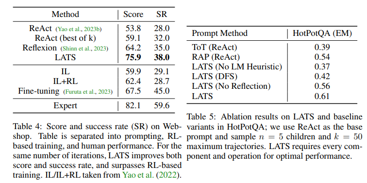 本文介绍了一个复杂的决策环境WebShop,它是一个在线购物环境,由一个包含1.18M真实产品和12k人类指令的网站组成。文章使用预构建的搜索和点击命令以及浏览器反馈和反思作为观察。通过平均得分和成功率两个指标来评估性能。结果表明,GPT-3.5与ReAct在WebShop中表现出与模仿学习相当的竞争力,并且可以超越强提示策略的强化学习技术。使用LATS可以显著提高性能,表明它可以在相同的迭代次数下实现更有效的探索。