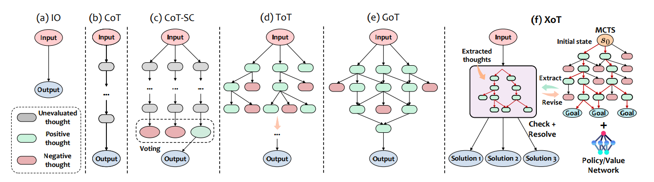 - CoT: 思维链(CoT)能够逐步解决问题,但仅限于线性思维结构,限制了灵活性。